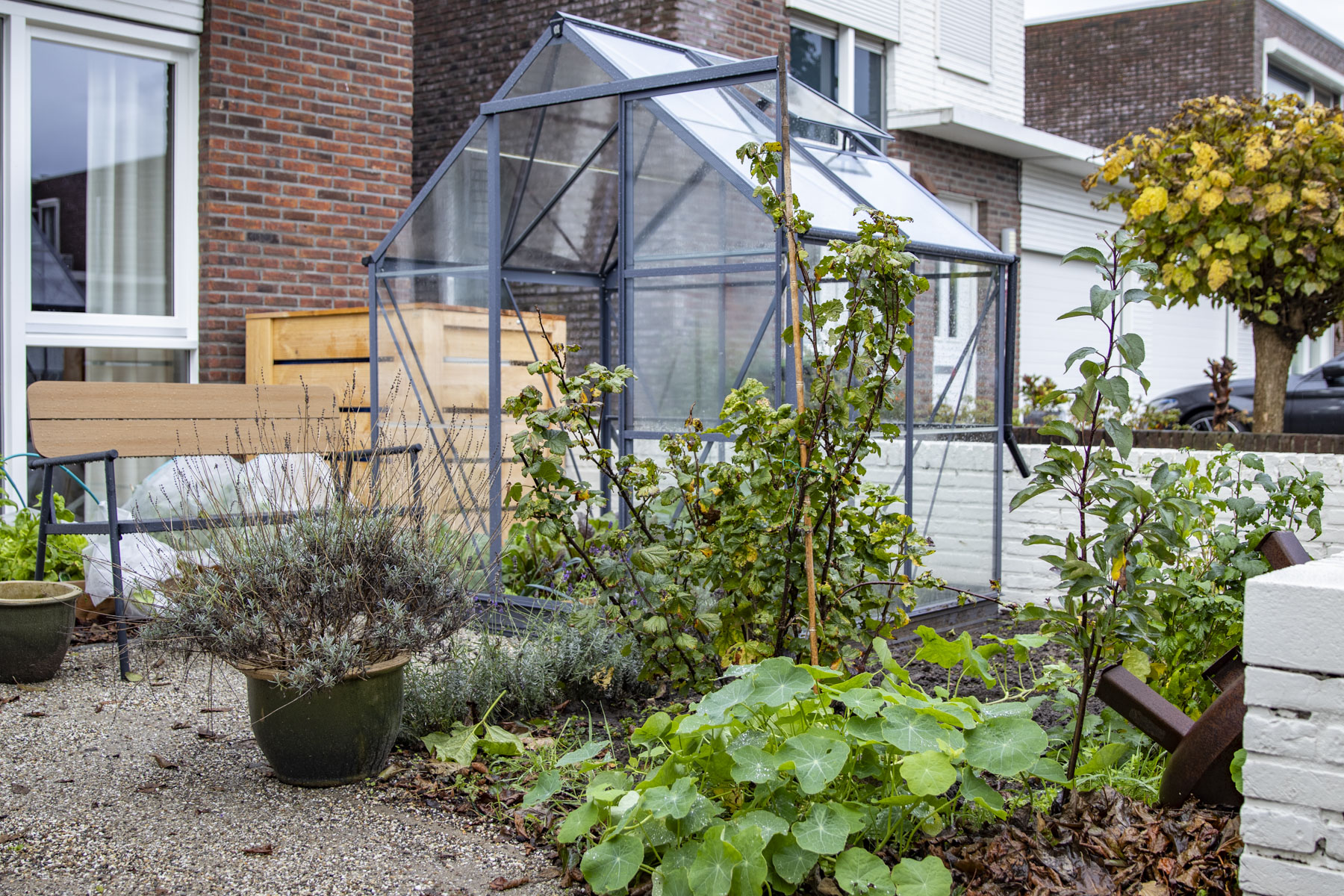 In de tuin plaatsten we een stevige kas die jaren meegaat. In augustus zette de klant groenten in de kas waar ze in oktober al lekker van konden eten! Daarnaast maakten we we twee verhoogde groentebakken van hout waar nu de kroppen sla en postelein mooi stralen. Met een paar simpele aanpassingen eet onze klant een hele hoop groenten uit eigen tuin!