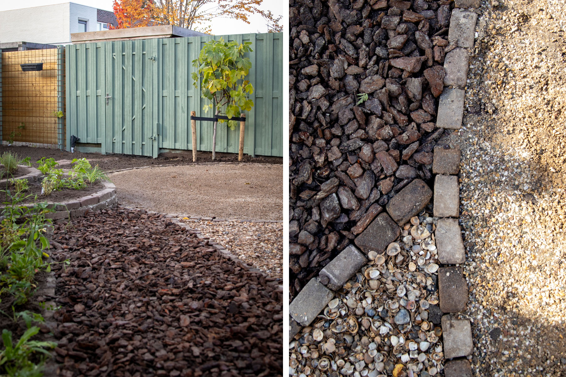 Het terras maakten we met Achterhoeks padvast, een stevig maar waterdoorlatend materiaal. Tuinpaden van boomschors en veldkeien geven een natuurlijke uitstraling en beperken verharding.