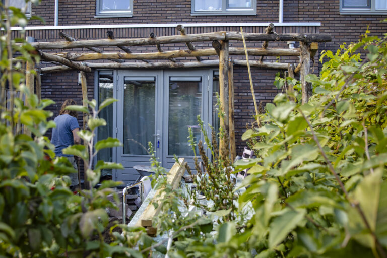 Toen de tuin weer netjes was, bouwden we een pergola van kastanjehout en daaronder een vlonder (nog niet op de foto’s).