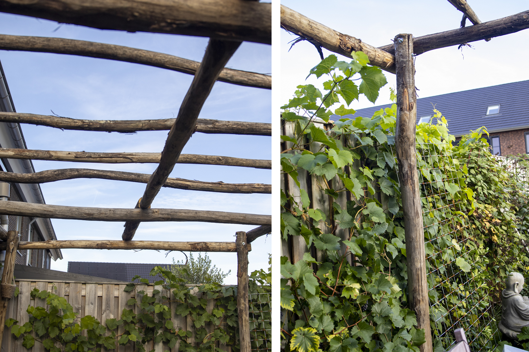 Toen de tuin weer netjes was, bouwden we een pergola van kastanjehout en daaronder een vlonder (nog niet op de foto’s).