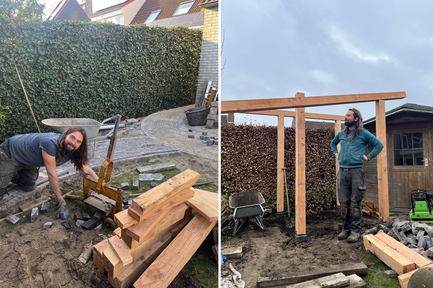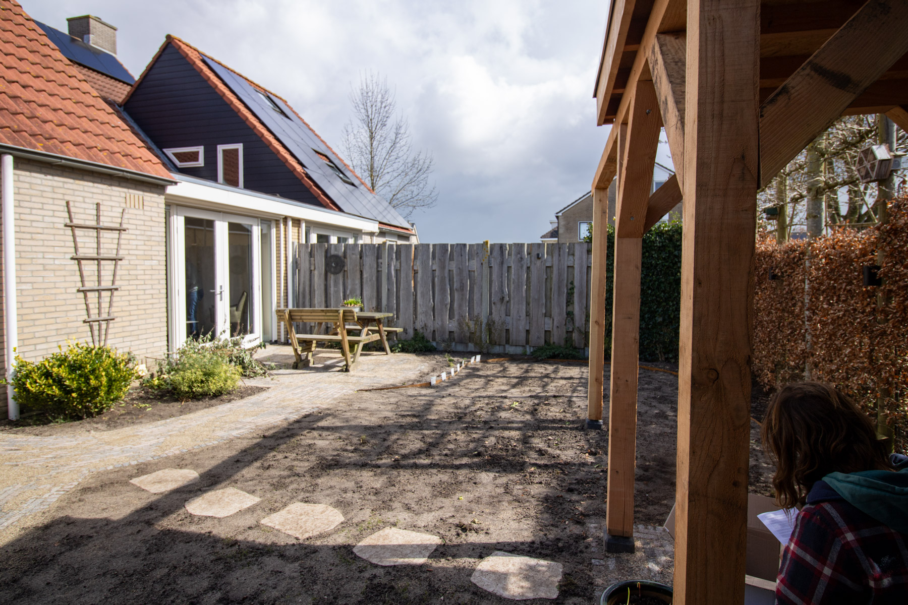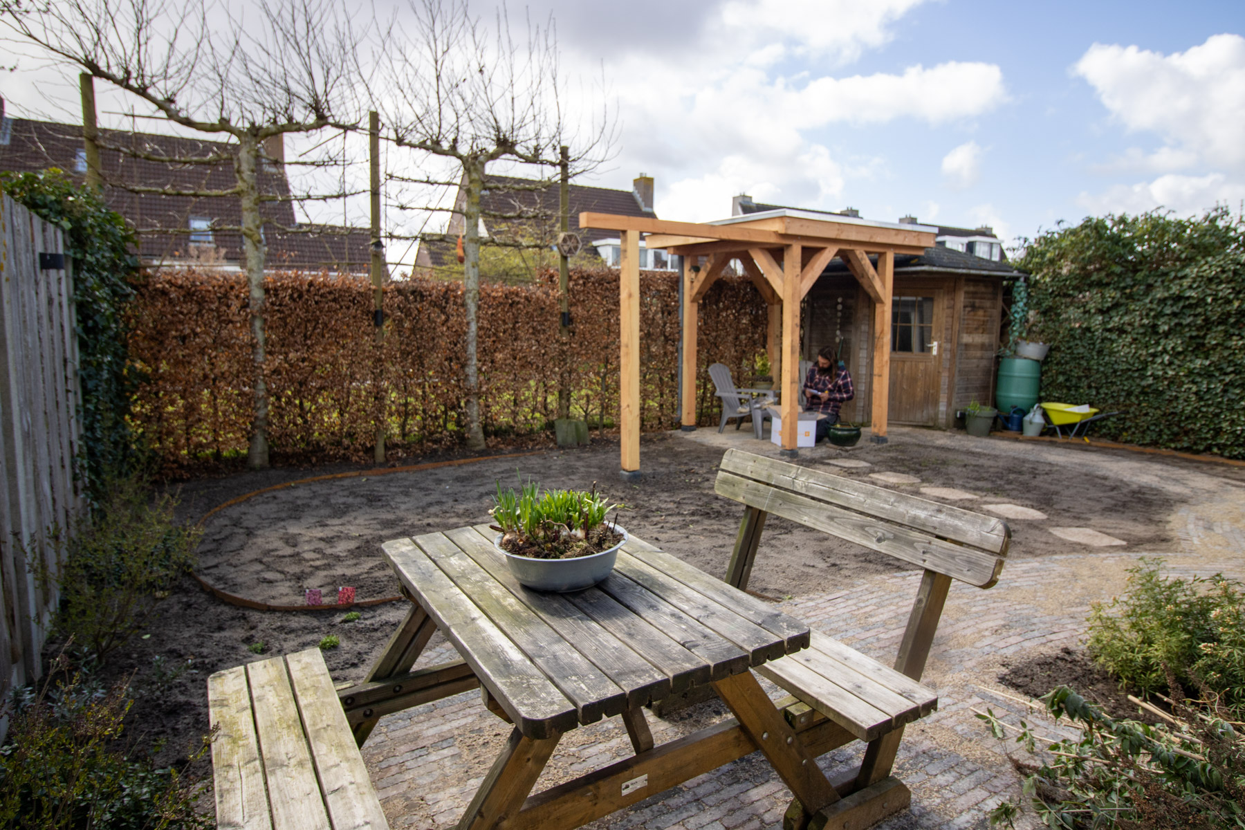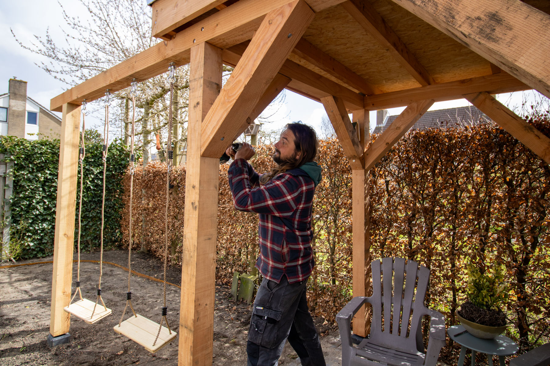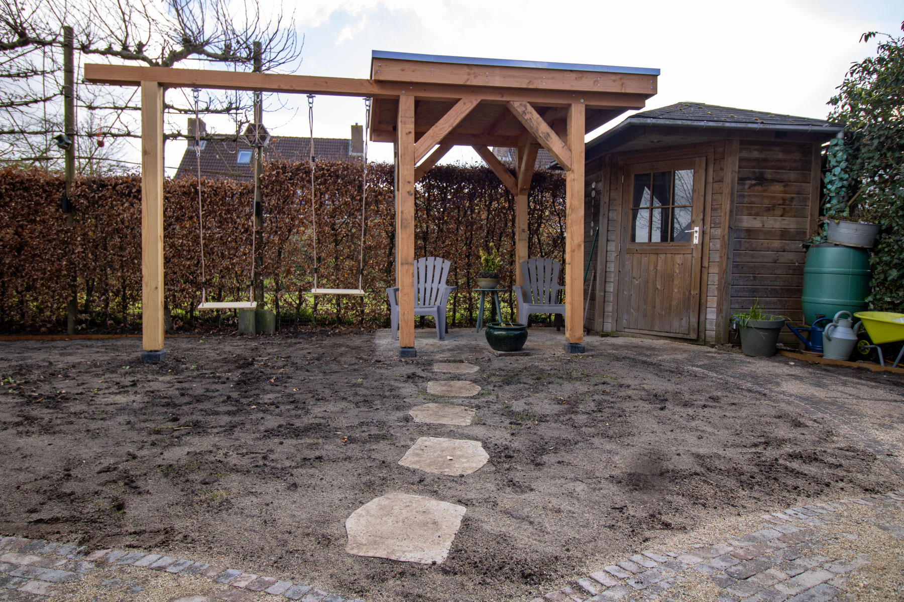We maakten een overkapping met schommels voor de kinderen. Een plek waar kinderen kunnen spelen en waar je zelf ook beschut kunt zitten. Zo is de tuin niet alleen mooi, maar ook echt bruikbaar.